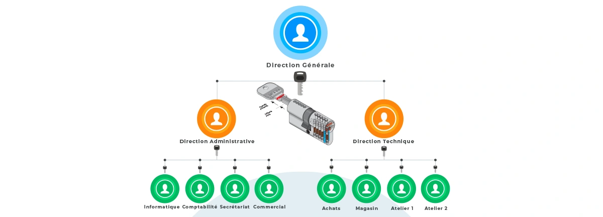 Nos organigrammes permettent de limiter les trousseaux, canaliser les accès pièce par pièce, et assurer la traçabilité des ouvertures par niveau hiérarchique : clé individuelle, passe-partiel, passe-général…
