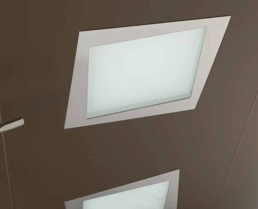 Finition vantail : lisse peint ou plastifié ton bois, motifs emboutis ou décors inox